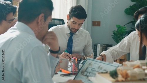 Top aerial view of project manager or civil engineer writing at blueprint and planning building design. Aerial view of architect working together at meeting table with document placed. Alimentation.