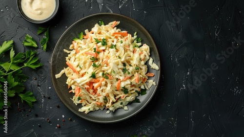 Top down view of a plate with coleslaw with creamy dressing on a dark texture background