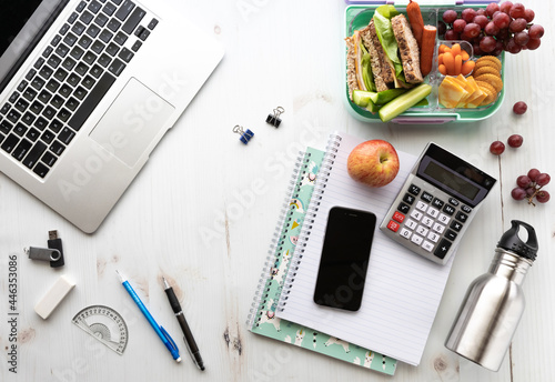 Top down view of a variety of school supplies, laptop and cellphone, along with a fresh lunch.
