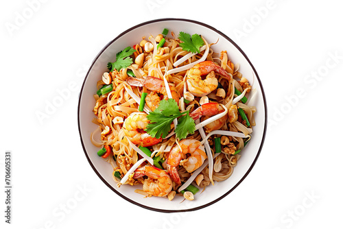 top down view of an isolated bowl of Pad Thai, showcasing the colorful mixture of noodles, shrimp and peanuts on a transparent and clean background.
