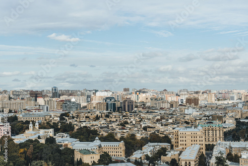 top panoramic view of baku city with huge area with buildings and parks around Icheri Sheher over cloudy sky