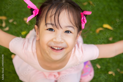 Top view and selective focus shot of adorable girl kid in pink ballet costume in playground looking up with pretty and lovely smile shows happiness of children and colorful life through her eyes