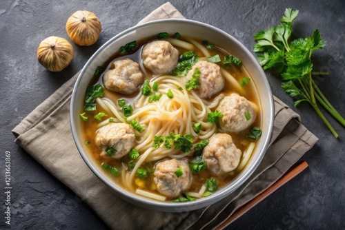 meatball, broth, chicken, green onion, topview, food photography, receipe, savoury, grey background, food, culinary, cookery, asian cuisine, hearty, comfort food, home cooking, cooking, eatery, epicure, healthy, deliciously, appetising, bowl, ingredient, steamy, warm, dinner, homemade, cultural, flavorful, aromatic