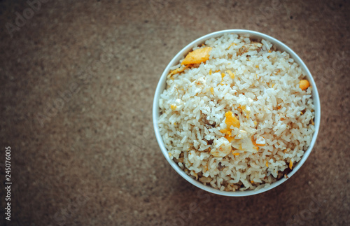 Top view. close up stir the rice with egg and pork in the bowl on wooden table