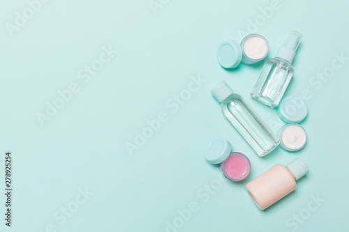 Top view composition of small travelling bottles and jars for cosmetic products on blue background. Facial skin care concept with copy space for your design