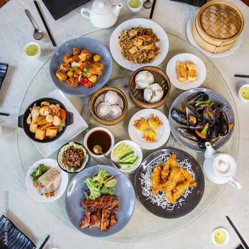 Top view food platter combo set of traditional Cantonese yum-cha dim sum Asian gourmet cuisine meal food dish on the round table includes dishes of duck, pork, fish, chicken, vegetables, tea