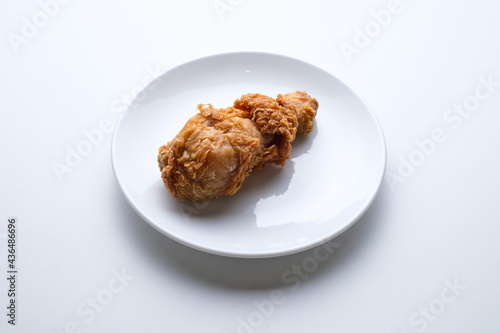 fried, chicken, leg, white, plate, isolated, background, fast, junk, food, crispy, drumstick, eat, meat, crunchy, poultry, gold, unhealthy, calorie, nourishment, meal, tasty, horizontal, cut-out, epicure, kentucky, studio shot, closeup, copy space, high key, no people, messy, spicey, indoor, deep, white background, top, view, cholesterol, fat, oil, hot, paper, diet, thigh, cooked, piece