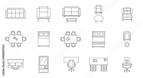 furniture, top, view, vignetting, drawing, plan, interior, design, layout, architecture, office, home, vector, illustration, hand, drawn, white, background, set, collection, table, chair, sofa, desk, cabinet, bed, couch, stool, ottoman, workspace, living, room, bedchamber, concept, draft, blueprint, element, icon, symbol, graphic, line, art, simple, minimalist, modern, retro, style, flat, overhead