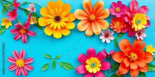 Top view image of colorful paper cut flowers with green leaves on blue background, colorful, vibrant, composition