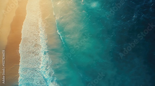 Top view of a beautiful blue ocean with sunlight sparkling on the waves and a golden sandy shore from a drone