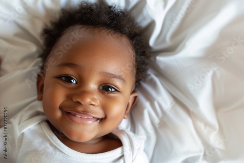 Top view of a cheerful toddler african american baby boy lying on bed.