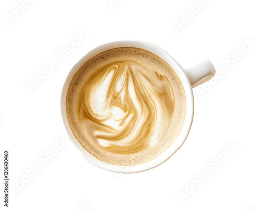 Top view of a cup of coffee with cream swirls creating a beautiful pattern, isolated on white background