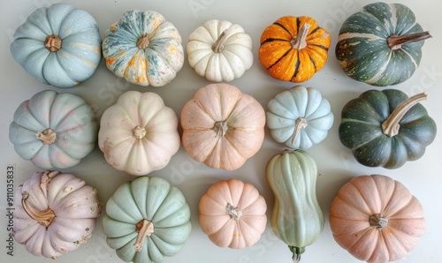 top view of a diverse, minimalist assortment of pumpkins, squash and gourds, all painted in soft pastel colours