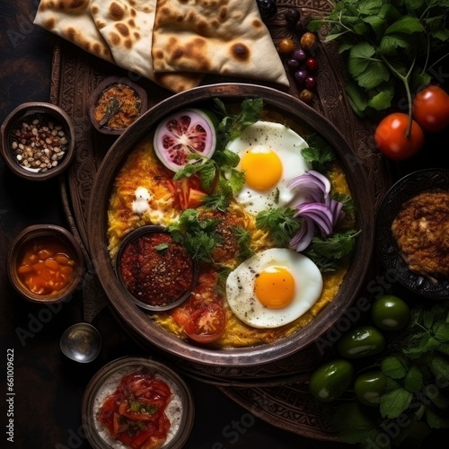 Top view of a fresh, delicious, wholesome and nutritious breakfast, beautifully decorated, food photography