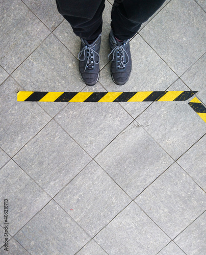 Top view of a man stands on industrial striped asphalt floor in front warning yellow black pattern and stop sign.