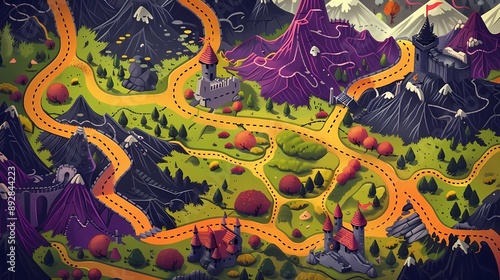 Top view of a map, cartoon, semi-realistic, a dotted path, adventure, treasurehunt, black moutains, fantasy, purple, green grass, orange, colorful, Generative AI illustrations.