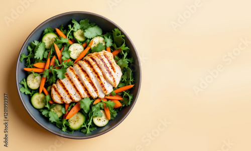 Top view of a nutritious salad bowl featuring grilled chicken, arugula, avocado, carrots, and zucchini on a pastel beige background. Perfect for clean eating and healthy lunch ideas.
