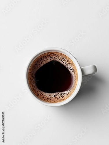 Top view of a white coffee cup with a handle. the cup is filled with a dark brown liquid, which appears to be coffee.