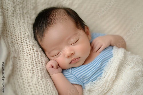 Top view of an Asian newborn baby sleeping on their back in a crib, wearing a blue striped shirt and a white blanket. This is a top-down photograph with a copy space area,
