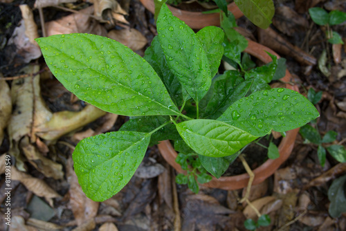 Top view of avocado tree that is about 1-2 months old. It has green leaves and looks fresh with water droplets. It was cultivated in pot and grew beautiful and strong. At rural organic orchard.