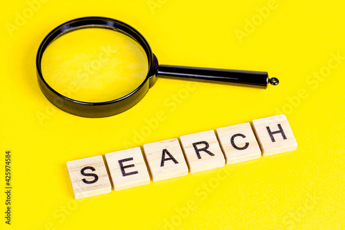 Top view of black magnifying glass with the word search on light yellow background.
