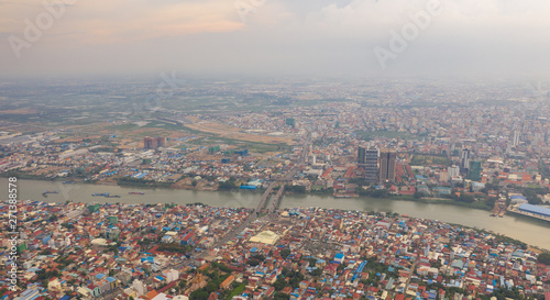 Top View of Building in a City - Aerial view Skyscrapers flying by drone of Ho Chi Mi City with development buildings, transportation, energy power infrastructure.