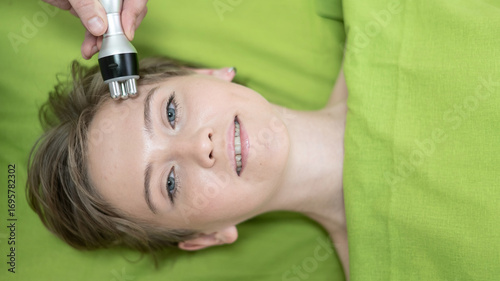 Top view of Caucasian woman undergoing radio wave RF lifting procedure in beauty salon.