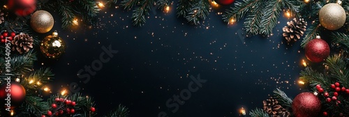 Top view of Christmas decorations: pine branches, golden lights, and red ornaments forming a frame with black space for writing.