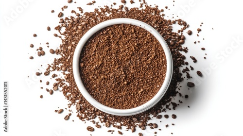 Top view of coffee cup and scattered ground coffee on white background generative ai