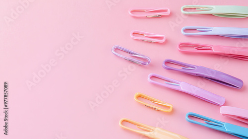 “Top view of colorful pastel hair clips arranged on a pink background. The modern accessories enhance hairstyles and add a touch of luxury with their soft, elegant colors.”