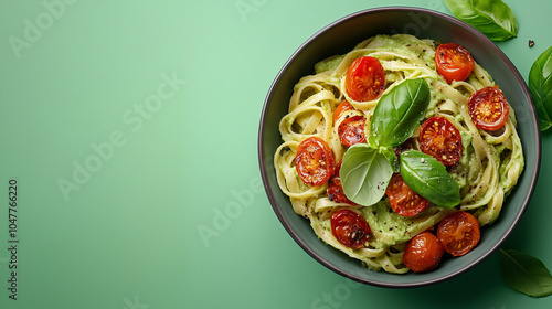 Top View of Creamy Avocado Pasta with Roasted Cherry Tomatoes and Basil on Pastel Green Background - World Vegan Day Special