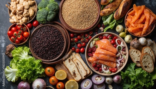 food, ingredient, cooking, fresh, healthy, salmon, bean, tomatoes, broccoli, bread, onion, garlic, lettuce, nut, variety, display, assortment, kitchen, meal, colourful, culinary, preparation, snack, diet, vegetarian, delicious, organic, table, aesthetic, seasonal, market, environmentally friendly, cookery, natural, arrangement, favor, vibrant, artisan, homemade, traditional, modern, baking, diverse, epicure, organic food, fresh produce, raw food, food photography
