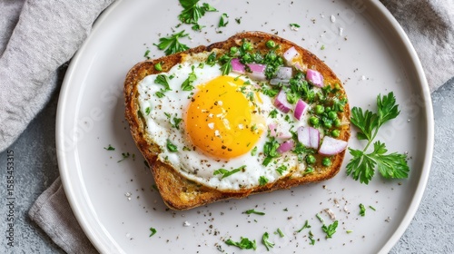 Top view of fried egg and pea toast with red onion and parsley on white