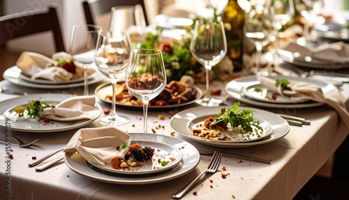 Top view of full dinner table with white plates, cutlery, and decorated plating.