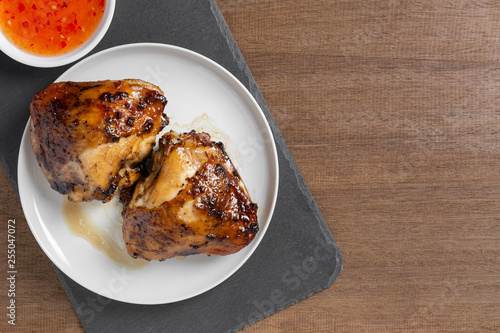 top view of grilled chicken thigh in a ceramic dish served with sweet chilii sauce on wooden table. homemade style food concept.