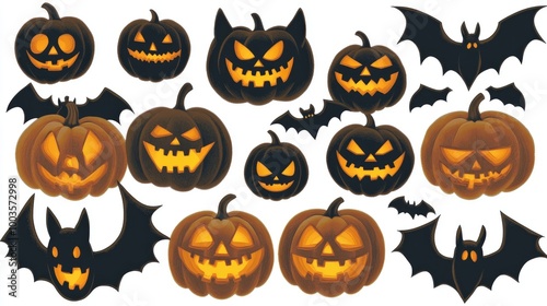 Top view of Halloween-themed pumpkins and bats, isolated on a white background with plenty of copy space for design. No people, no logo.