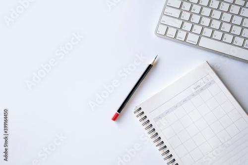 top view of office desk workspace with open book, pencil and keyboard on white table background. flat lay