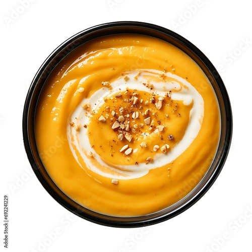 Top view of pumpkin and carrot cream soup isolated on transparent background.