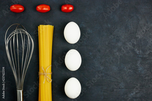 background, cookery, dry, food, italian, pasta, rustic, cherry, cooking, egg, dinner, fresh, ingredient, italy, mediterranean, uncooked, table, tomatoes, view, wooden, board, spaghetti, top, black, cheese, flour, epicure, spice, traditional, wheat, noodle, dark, group