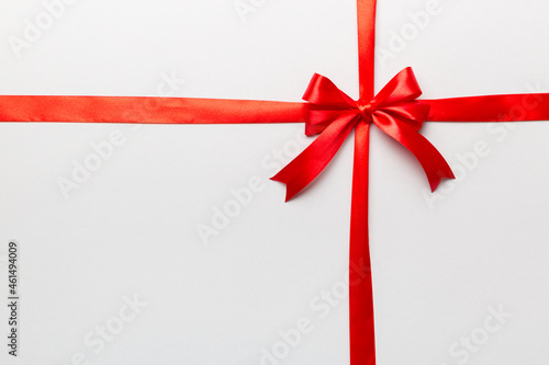 Top view of Red ribbon rolled and red bow isolated on colored background. Flat lay with copy space