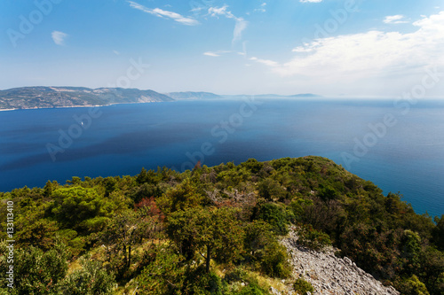 view, up high, sea, landscape, aerial, water, nature, mountain, coast, ocean, summer, europa, blue, travel, bay, beach, beautiful, high, seascape, panoramic, horizon, sunny, coastline, green, beauty, coastal, colours, croatia, tree, hill, slope, land, clear, sun, quiet, calm, nobody, top