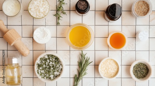 Top view photo for advertising use of cream, body lotion, watery products, serums in bottles containing natural ingredients and decorated around with natural ingredients and flowers.