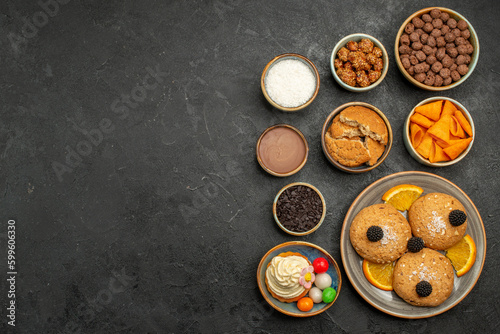 top view sweet cookies with chips and orange slices on dark background fruti cookie biscuit sweet pie cake