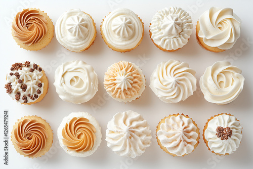 Top view varies of white theme cake isolated on white background, Selective focus various fancy cup cake on white background.