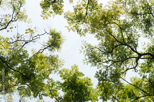 tree, forest, sky, nature, green, leaf, tree, summer, leaf, tree branch, branch, foliage, spring, blue, wood, oak, wood, natural, sun, birch, sunlight, trunk, park, environment, outdoors, up high, background, beautiful, beauty, below, bright, circle, cloud, countryside, crown, day, landscape, light, nobody
