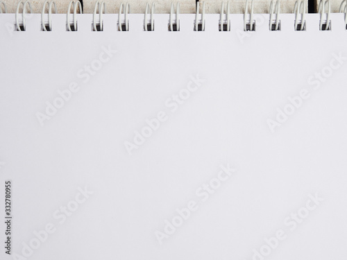Top view. Work space. Flat lay. Succulent in a white crimson pot close-up. Open notebook or notepad with light sheets. Copy space. Place for text. Selective focus