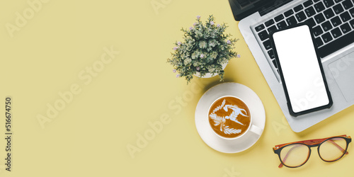 Top view, Yellow Office desk with laptop computer, Blank screen smart phone, cup of coffee and eyeglass copy space, Mock up..