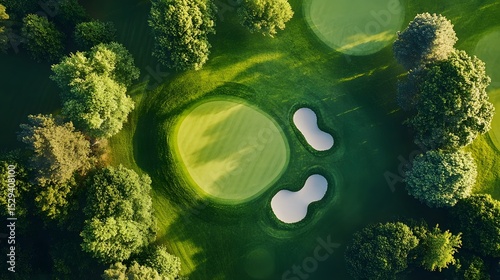 top-down drone shot of golf hole and surrounding greens