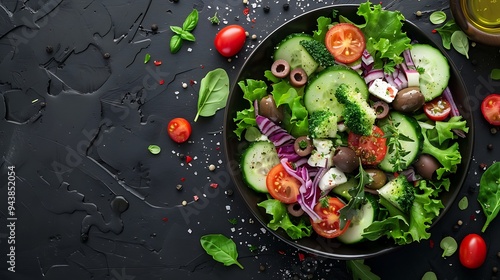 Top-down view of a Mediterranean salad with cucumbers, olives, feta cheese, and tomatoes, drizzled with olive oil and sprinkled with oregano, on a dark wooden table,