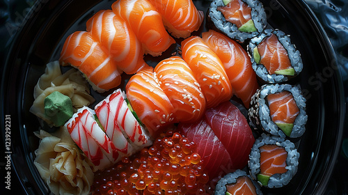Top-down view of a sushi platter, vibrant salmon, tuna, and avocado rolls, on a sleek black plate, elegant restaurant setting,